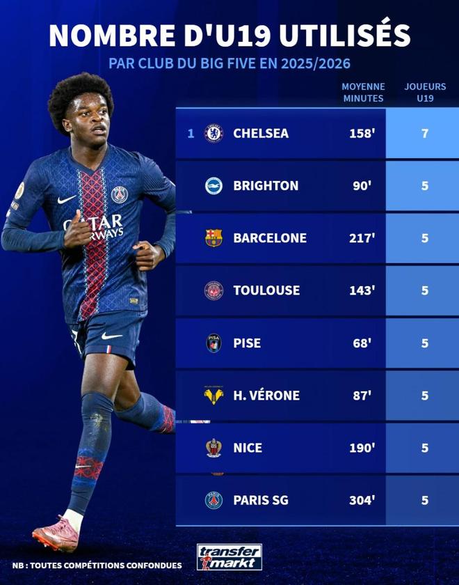 10月7日,北京时期,德国运动的统计数据指出,巴黎圣日耳曼是为U19球员提供最多欧洲五个欧洲大联盟俱乐部的俱乐部,切尔西是使用U19球员的俱乐部。根据德国转会统计数据,巴黎圣日耳曼教练路易斯·恩里克(Luis Enrique)今天总共使用了5名U19球员,总时间打了304分钟,而切尔西教练Maresca使用了7名U19球员,总比赛时间为158分钟。巴塞罗那也在名单上,弗里克(Frick)给了五名U19球员,总共217分钟的比赛时间。 Top 8 players used by U19 clubs in five major leagues up to this time: Chelsea 7 Player 158 minutes Paris Saint-Germain 5 Players 304 minutes Barcelona 5 MagsAuto 217 Minutes Nice 5 Player 190 points Toulouse 5 Players 143 minutes Brighton 5 Players 90 minutes Verona 5 Players 87 minutes Pisa 5 Players 68 minutes [Exclusive View of Premier League on Migu]
