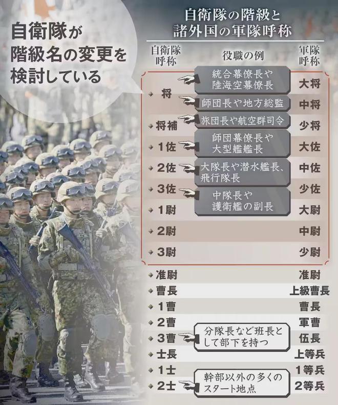 几十年后,“上校”将回归。据《环球时报》援引日本《产经新闻》11月12日报道,多位政府消息人士称,高市早苗政府正在考虑改变日本自卫队的“军衔”。具体变化包括:将参谋长联席会议和陆海空参谋长中星级较高的将军名称改为“将军”;其他“将军”将改名为“中将”; “第一上校”和“第一中尉”将分别更名为“上校”和“上尉”。自卫队变化前后图表对比 来源:产经新闻 日本自卫队目前的军衔级别是在二战后确定的。 1945年,日本战败,军队被解散,军事机构被废除。 20世纪50年代,日本自卫队成立期间,引入了一套新的头衔,以缩小军队的影响范围。 “上校”、旧日军中的“二副”、“少校”被改名为“大佐”、“二副”、“三副”。如今,“大佐”这个历史符号或将复活,引起各界广泛关注。这是否预示着某种回归或复兴?比名称变更更需要关注的是功能上的突破。据右翼保守媒体《产经新闻》报道,“大佐”的公共目的此次改名是为了“与各国军队保持一致”和“易于理解”,据报道,现有制度的问题在于,相应的英文翻译与外国军队的翻译大体相同,但日文表达却存在差异,因此,在中美联合演习等场合,如果军事名称与其他国家保持一致,将有助于提高“公众对自卫队的了解”和“提高自卫队的地位和士气”。但此时的更名显然不仅仅是为了“方便”。作为“安倍路线”的继承者,高市早苗继承了安倍晋三期待已久的政治意愿,将继续推动战后“日本国家正常化”。日本问题青年学者、辽宁大学日本研究中心客座研究员陈阳在接受长安街知事采访时表示(微信ID:CapitalNews)认为,高市政府的军衔调整可以被视为推动“日本国家正常化”的一步,“正常国家论”的核心是让日本重新获得对外使用军事手段的权利,值得关注的是该标志背后的自卫队职能的变化。尖头o但进入21世纪以来,日本的安保政策由防御性转向进攻性,自卫队职能不断拓展。 1947年制定的日本宪法(又称“嘉由路宪法”)明确规定日本否认战争权利,不能维持战争能力。然而,通过一系列修宪和“三个安全文件”(国家安全战略、国防战略、国防力量计划)调整、军费增加、武器升级、打击范围扩大……“国防为本”的安全政策一次又一次被打破,背离更加积极的国防政策。尼塔瓦拉空军基地附近的战斗机。 2022年底,日本再次修改“安全三文件”,其中明确包括发展“反击能力”。高市早苗上台后,计划修改“安全三文件”。“从某种意义上说,‘和平宪法’设定的框架不断被打破,自卫队不受任何限制。”王星宇说。从和平主义、专属防卫到先发制人、机动打击,日本战后成为政治强国、军事强国的野心逐渐明朗。高市早苗上台后的种种“考验”不断放出在核拥有问题上,他拒绝就“是否会遵循‘无核三原则’”给出明确答案,但强调“现在还不是深入讨论的时候”。近年来在军事领域采取行动,这条原则始终是一条红线。现在,高市政府的不明确行为,造成了这一原则的空白。陈阳指出,“无核三原则”如果发生改变,将对地区局势产生深远的颠覆性影响,特别是“不进口”原则,关系到美国核武器能否进入日本或在日本部署。此外,高市早苗还多次在台海问题上投掷政治炸弹,称“中国对台湾使用武力可能对日本构成威胁”。 “这是一个存在的危机局势。”这分明是在利用台海问题作为日本修宪扩军的借口。王兴宇认为,由于特朗普访日,高市早苗误认为日美同盟正在进入“黄金时代”:“他想打‘台海牌’,试图对日美同盟造成影响。”输给了美国,却没有意识到台海问题触及中国的利益。白宫的冷淡回应无疑是两盆冷水。他们不仅抹去了日本右翼试图利用美国支持插手台海的幻想,也摧毁了高市早苗“对华强硬”的政治形象,让他火烧火燎。为什么要小心“将军”“回到‘大校’的称号。据日媒称,军衔的变动只会保留或留下大校是日本历史上的军衔,属于军官的最高级别,是一段痛苦而耻辱的集体记忆。表明企图否认侵略罪行,与历史责任撇清关系。那段历史并没有被忘记。”