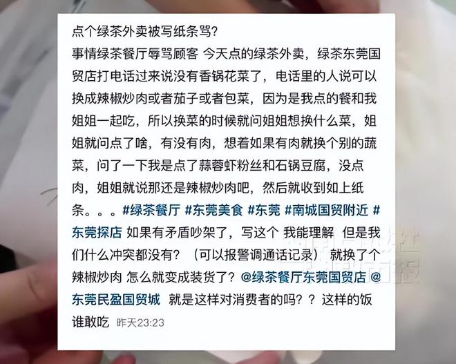 9月7日,广东的一名妇女在一个社交平台上发布了一条消息,称他在当天在绿茶餐厅的Dongguano商店订购了一份外卖店,当时无缘无故感到尴尬。 “谁敢吃这顿饭!”图片显示了该女子帖子的屏幕截图。女人描述了它。下订单后不久,店员打电话通知香肠,出售了香锅花椰菜,如果可以用辣椒炸肉或其他肉代替。 Tapcommunication OS,他选择了炸胡椒。但是,当交付外卖时,他发现食物包装上有一条纸条,上面有“笑死,装载”,这使得它做成了他生气。该名女子在下面的下面发表了一张便条后,该名女子与网民进行了激烈的讨论,并对涉及餐厅服务的质量表示怀疑。 9月8日,该名女子发表了另一篇文章以更新事件开发项目,称绿茶餐厅与她联系,并承认情况是真的。餐厅提供的解释是:店员错误地将命令视为草稿,”他不小心将其用作草稿,碰巧我们是由破坏性人派遣的。”该名女子说,餐厅的回应是,店员被误认为是命令的命令,作为纸在8的制作中。记者联系了海报,但没有收到任何回应。后来,他打电话给绿茶餐厅东鸟吉玛商店,但没有人接电话。随后,记者联系了绿茶餐厅的杭州总部。工作人员说他们会安排社会同事应对此事负责,并将尽快提供特定的处理结果。在第8:20左右,绿茶集团媒体的负责人与记者接触,并表示了解了消费者的理解,该地区的负责人向消费者道歉,并退还了客户的外卖订单。关于相关的处理情况,涉及雇员的负责人是 - 拟议并发出了严重的内部通知。将来将加强员工管理人员和意识服务的培训,以防止再次发生类似事件。关于这种侮辱性的话,负责人说他真的不确定。这是员工的个人行为。至于原因,他将来将进行后续调查。记者指出,事件合并后,涉及东圭吉马商店的绿茶餐厅受到批评第三方外卖平台上的大量网民和商店收视率在一定程度上受到影响。根据绿茶餐厅的官方网站,2008年,绿茶集团有限公司开设了第一家“绿茶餐厅” Longjing主商店。经过十七年的开发,绿茶餐厅在全国130个城市中分布在500多家直销商店。资料来源:Sanxiang Metropolis Daily综合一般新闻