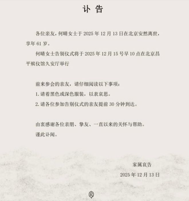 据扬子晚报等媒体报道,家属昨天(12月13日)发布的一份指南显示,著名演员庆在北京安详去世,享年61岁。告别仪式将于12月15日上午10点在北京昌平殡仪馆九安堂举行。何庆逝世讣告。扬子晚报“电影观察者于勇”证实了该媒体消息。他在社交平台上发布了何晴的黑白照片,并配文“天上无病,佘晴,大美人,一路走好”,引发网友和娱乐圈人士的集体缅怀。于勇透露,自从生病以来,他一直想保持低调,让大家永远记住他的好形象。地位:“古典第一美女”何晴是唯一演遍四大经典的内地女演员。 1964年1月13日出生于浙江衢州江山市。他毕业于浙江g昆剧团。 1983年,凭借《少林弟子》正式进入演艺圈。她是中国内地唯一一位出演过四大影视的女演员,被誉为“古典第一美女”。她是中国内地唯一一位出演过四部主要影视作品的女演员。红星新闻:在1986年版《西游记》中饰演灵济菩萨化身莲莲; 1988年,在电影《红楼梦》中饰演多愁善感、不幸的秦可卿; 1993年,《三国演义》中温柔美丽的小乔成为她的经典形象; 1996年,在《水浒传》中演绎了李大师高贵典雅的人物形象。正如你除了四件代表作外,他的艺术成就还涵盖了多种题材。 1992年,她是内地首批“瑶族女孩”之一,与华友林主演《青河草》,塑造了独立自主的形象。nt和知识新时代。 1998年,他在《澳门故事》中突破经典戏曲,与欧弟饰演豪放大胆的中葡混血。丝绸; 2011年,在《大宅1912》中饰演杨九红一角,与陈宝国合作诠释乱世爱情; 2016年,她在《女医传奇》中首次挑战反派,清晰诠释了孙太后的残忍与温柔。从昆曲舞台到影视,他以扎实的演技、独特的古典举止,塑造了数十个鲜活生动的人物形象。他的表演真实、质朴,对古今人物的刻画能力,让他的很多形象成为观众心中难以复制的经典。有趣的事实:《西游记》的人物是在火车站“捡到”的。据潮媒报道,何晴今年5岁,能歌善舞。看完《惠特《电子毛女》和《红色娘子军》中,他开始自学舞蹈,不到两周,鞋尖就累了。1978年,14岁的他考入了北京戏剧学院、浙江艺术学校和浙江昆剧团。最终,他选择了浙江昆剧团,成为一代艺术家。这个班可以说是浙江和昆明的明星班。何青、刘小灵通、林伟林、邢金沙、邢岷山、张志红、李恭禄等都是同学,1983年,香港三洋公司的导演华山去昆剧团寻找演员,当即选中了刚刚结束训练、穿着运动装的青,在拍完《少林居士弟子》后,就出演了小琴一角。从北京坐火车回杭州,他遇见了电视剧《西游记》的导演杨杰。为三仙灵济菩萨祈福。他在火车站见到了清,觉得很合适。他正要追上,却迷失了方向。一次偶然的机会,青在餐桌上吃饭时认识了六岁的张金来。 《绿江草》中的华友林。曹欣六小龄童也是浙江昆剧团的演员,两人是同事。 “佘晴,你来北京做什么?” “你在拍电影,怎么样?” “我要去拍摄《西游记》的外景地。” “对了,我们导演正在物色一位女演员来扮演三仙灵济菩萨,我觉得你很合适。”六小龄童和杨杰导演很有默契。就这样,他还是扮演了灵济菩萨,怜怜。后来他就去演戏了。后来在《红楼梦》中饰演秦可卿。她融合了清代古典美人和西方美人的外貌,高挺的鼻子和小嘴。从此以后,他因为一直扮演具有各种行为的服装角色。 《戏里戏慈禧》里,温柔的慈安。 Aof《情剑山河》讲述了南唐皇后李渔的故事。她在剧中饰演周朝诡计多端的皇后庆。 1998年,在《天之骄女》中饰演刁蛮的明朝公主和她的侍卫程铁衣的故事。 2003年,在《射雕英雄传》中,弱小的包惜弱。现代服装也很漂亮。比如《少女别动队》中的林曼韵。她还有一个比较经典的角色,《河边青草》中的华又霖。她也是第一位主演琼瑶剧的内地女演员。很多观众认为男主真是瞎了眼,为什么不喜欢美丽开朗的华友林呢。朋友:十年前,她的朋友发博为她祈祷,还试图阻止她整容。据红星新闻报道,2015年,庆被诊断出患有癌症。后经过漫长而艰难的治疗,她于2016年病愈,并在古装剧《妃子传奇》中挑战反派“太后”,展现了深厚的演技。此后,他逐渐淡出公众视野,很少出现在荧幕上。据潮媒报道,《女医传奇》于2016年播出,是她留给我们的最后一部作品。此后他很少出现在公众面前,但偶尔出现在综艺节目中,他仍然会唱昆曲。 2012年,在《年度盛典》节目中,她清唱了《园中牡丹亭》的一段。 2013年,她在《北京》节目中演唱昆剧选段《牡丹亭》,充分展现了昆剧的温柔与美丽。 2016年浙江昆剧团成立60周年,一位老同学说要回剧团与同学们团聚,但最终他没有来。据广民介绍g.com 2016年9月5日消息,近日,有网友曝光何晴的近照。她戴着眼镜,化着淡妆,看起来还是很好看的。此前,他因健康状况不佳需要康复而很少露面。近日,有网友在贴吧爆料:“庆姐今年3月初在微信上发了一张自己的近照,没有化妆,没有化妆。经历了大病之后,庆姐看上去还是……很年轻!但我问庆姐要不要发给粉丝,她说不能发!”3月5日,黄绮珊在微博上发了一张何琼的照片,并配文:“每天为我亲爱的庆姐守望祈祷。”愿治愈之手和信仰之灵与你同在!”很多网友怀疑他是不是生病了。事实上,2013年之后,清的曝光率急剧下降。网友们在微博上留言为他祈祷:“愿他早日康复”、“大家都平安”、“这么好的人应该继续展现好角色”。2013年4月15日,《宅门1912》开播,她公开透露自己曾试图阻