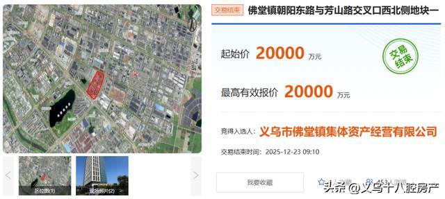 12月23日,佛堂镇朝阳东路与房山路交叉口西北侧地块成功出让。义乌市佛堂镇集体资产管理有限公司获奖。土地底价2亿元。 该地块位于义乌市佛堂镇朝阳东路与房山路交叉口西北侧。土地出让面积35,414.31平方米(53.121公顷),起拍价2亿元,投标保证金4000万元。用地:商业金融用地,适宜建设商业建筑及配套建筑,容积率2.50-2.70,建筑密度20%-30%,绿地率≥20%,建筑高度≤100米,商业金融用地出让期限40年。这块土地与土地上的建筑物一起出售。房屋评估价值为456.981万元,土地受让方须将这笔款项打入土地出让人指定的账户。佛堂镇政府自签订转让合同之日起30日内。根据规划条件,允许商业建筑产权分割、出售。销售比例不得超过建成用地总面积的70%,最小划分建筑单元不得少于300平方米。建筑立面应具有公共建筑的立面形式和建筑特征。建筑宜采用公共走廊布局,卫生间应集中于各层,不宜采用单元式或住宅式设计。标准层高不超过4.2米。除集中厨房、采暖设备房外,地块内建筑物不得焚烧,不得设置厨房和设计安装其他管道燃气设施。该地块原有的四栋建筑和地下室均被保留。地上总建筑面积约为占地约8.9万平方米,地下总建筑面积约2.25万平方米。详细信息有待调查和测绘。允许开发利用范围内地下空间主体结构垂直使用深度大于-12米。地下室仅用于停车、人防、消防等基础配套设施,严禁改变用途。