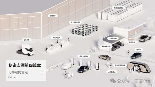 9月2日,特斯拉正式宣布了蓝图开发的下一阶段 - 秘密目标的第4章。新分会开发的重点从电动汽车和能源转变为AI人工智能和机器人领域,旨在通过创建一系列产品和服务来实现“可持续繁荣”时期,旨在将AI纳入物理世界中。新的章节将指导我们建立一个新世界,尽管在视觉的早期阶段,但它并没有发生。通过创建一系列产品和服务,我们深入将AI包括在整个现实世界中。在过去的二十年中,通过电动汽车,ProductsEnergy和人形机器人的开发,我们已经不再努力为这一技术变化奠定基础。今天,我们结合了自动化技术制造能力,以推出新产品和服务,以使所有人受益并加速全球繁荣和人类发展nt。我们将硬件和软件结合起来,以创造一个更安全,更清洁,更美好的世界。这是一种可持续的繁荣。本章首次将AI深深地包括在物理世界中,并提出了五个基本原则:无限的增长,变化的变化,技术解决方案,自动化集成和技术共享。与专门用于电气化和能源的前三篇文章相比,第四篇文章添加了剪切产品,例如Optimus人形机器人和自动驾驶在线汽车 - 驾驶汽车,并强调通过统一的硬件软件和建筑对人工,旅行和能源系统的重建。马斯克曾在制备阶段称其为“史诗般的”蓝图。随着秘密扩大的第四章发布,马斯克重申了特斯拉机器人业务的重要性。他说,FSD和Optimus的大小是最重要的,而特斯拉的价值中约有80%来自Optimus机器人。秘密地图1-4第1章(2006年)摘要:创建高性能的电动跑车:跑车发射标志着特斯拉的出生。使用跑车收入来产生覆盖范围-cars -cars:Model S在市场上。使用负担得起的电动汽车的收入来生产市场电动车辆:可用的3型。SolarPower Head:通过获得太阳能,Tesla扩大了其在太阳能和能源存储领域的业务。第2章(2016年):合并的能源解决方案:太阳能屋顶和电动车墙电池系统为房屋提供了清洁能源。改进的电力产品线:启动X型,Y型,Cybertruck和Semi电动卡车涵盖了更多的市场领域。自动驾驶技术:自动驾驶和FSD技术的开发为实现自动驾驶舰队的基础奠定了基础。建造具有完全自动驾驶功能的汽车,并通过汽车共享计划实现自主舰队。第3章(2023):完全切换到DE -ElectriCAL车辆:将电动车辆的成本降低到Pinnovative技术,并促进全球运输领域的全面电气化。 促销热泵应用:在家里,商业和工业领域促进热泵技术以取代传统的热量方法。存储氢能和能源:开发高温储能系统和绿色氢能,以支持大规模的能量存储和转换。 可侵略燃料应用:探索用于运输的可持续燃油解决方案,例如飞机和船舶,并在飞行和运输领域促进电气化。驱动现有的电网:使用可再生能源来优化现有的电网结构并实现绿色升级到电力系统。